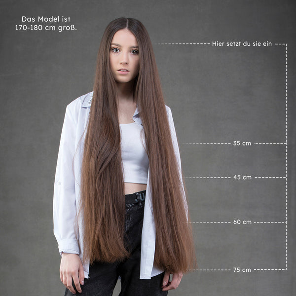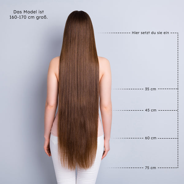 Keratin bond extensions are available in the following colour variations: single colour, highlighted, balayage, root and ombré. The 75 cm length is only available in single colours. The length of the root and ombré extensions depends on the hair length: